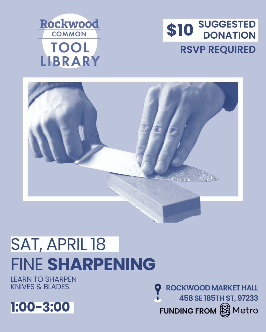| Learn to sharpen knives and blades. • Bring your own knife to practice on. • Knives must be wrapped in a towel or bag for safe transportation and handling. • Japanese steel and serrated knives not recommended. This class is intended for fine blades. Items like axes and shovels will not be sharpened at this event. Workshop held in main dining room of Rockwood Market Hall. Pre-registration required. Suggested donation $10. Pay-what-you-can & free spots are available. Send an email (librarian@rockwoodcommon.org) or call/ text 503.358.4945 if you need help registering or applying discount. | ![]() |