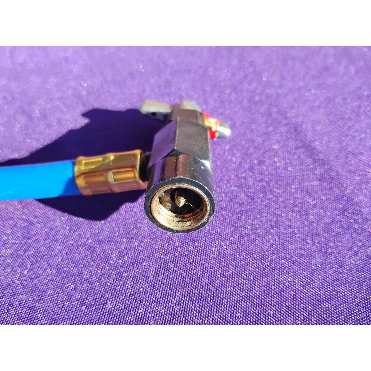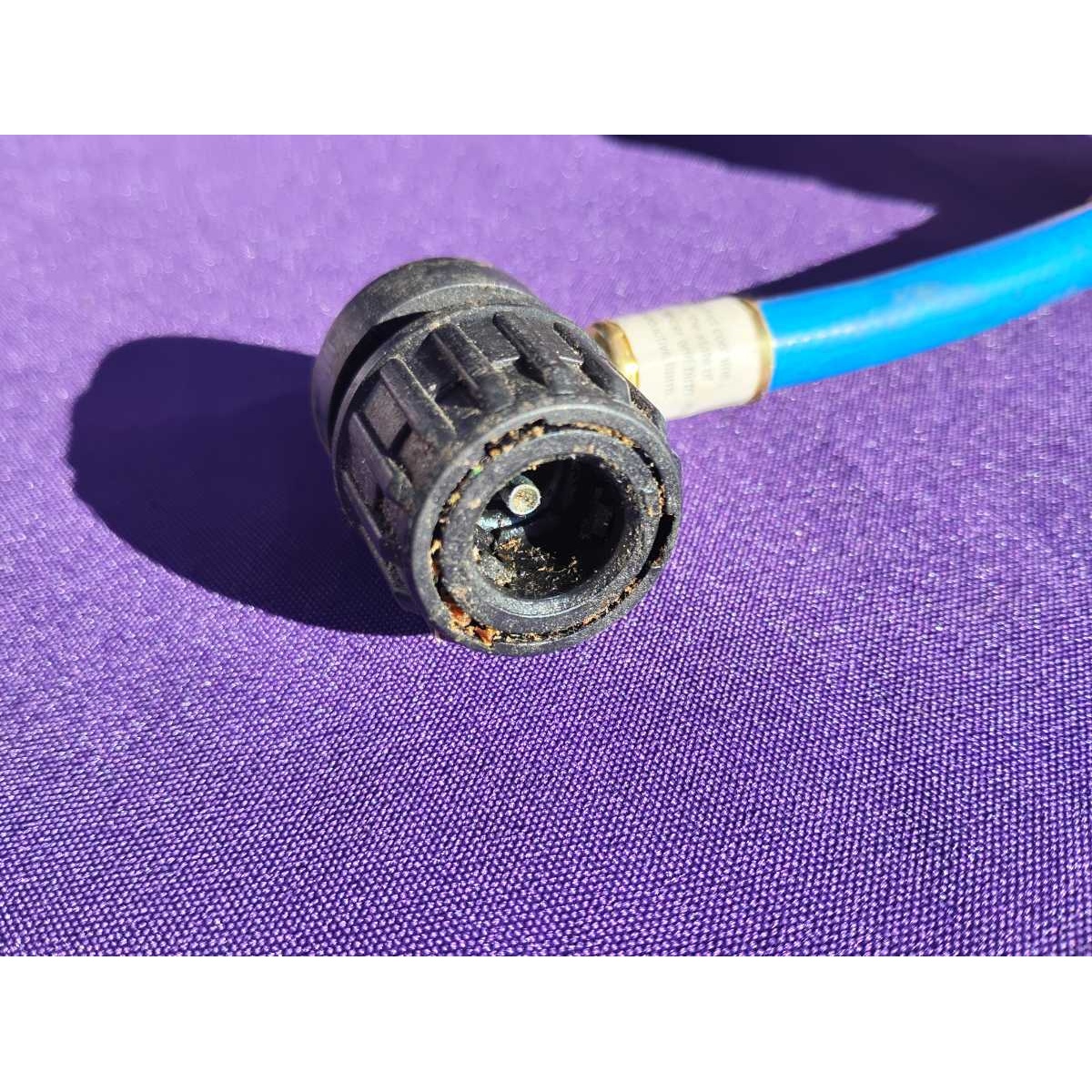 Add refrigerant to your car's AC using this twist release hose with adjustable gauge. May work with some refrigerators.